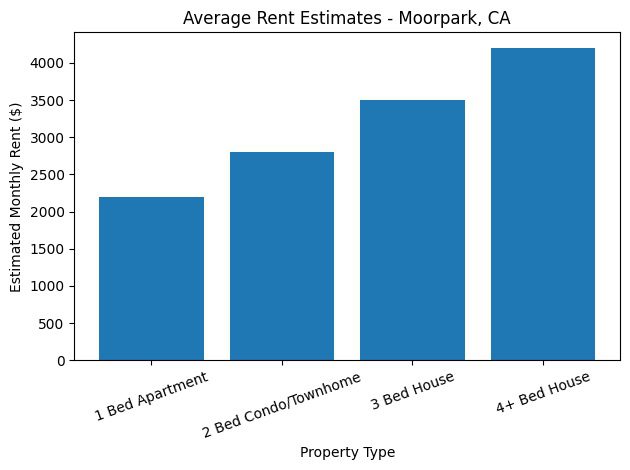 Typical rental price ranges for homes and condominiums in Moorpark, California. Rental prices vary based on neighborhood, property size, condition, upgrades, and current market demand. For a more accurate estimate, visit our How Much Rent Can I Charge in Ventura County page.